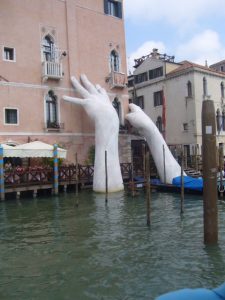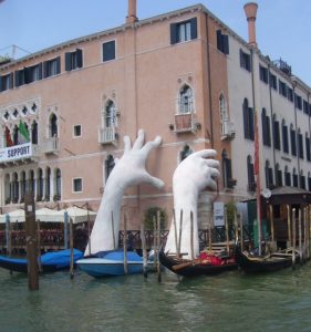Ein Highlight der ersten Woche war die Installation auf der Dachterrasse des Hotel Gabrielli an der Riva degli Schiavoni mit ihrer atemberaubenden Aussicht auf die Lagune. Dort hat die Künstlergruppe „Super+“ (Alexander Deubl, Konstantin Landuris und Christian Muscheid ) in Kooperation mit dem Architekturbüro UNS eine bewegbare Bar in Anlehnung an den bayerischen König Otto I. installiert, der 1832-1862 von Griechenland aus regierte und dort das Brauereiwesen nach dem deutschen Reinheitsgebot einfuhr. Der Barkörper und die Arkadengänge des Baus sind eine Hommage an den 1909 durch Mitwirkung der Künstlergruppe Münchener Secession im neoklassischen Stil erbauten „Padiglione Bavarese“, den Vorgänger des heutigen in der NS-Zeit erbauten „Deutschen Pavillons“ Zeitgenössische Kunst verwandelt in den nächsten Monaten das äußere Erscheinungsbild der Stadt, die sie großherzig aufnimmt und mehr und mehr zum Freilichtmuseum wird. Aus dem Canal Grande sichtbar wird zum Beispiel die zwanzig Meter hohe „Golden Tower“ von James Lee Byars, während aus einer Terrasse über dem Wasser bei der Ca‘ Doro zwei zyklopische weiße Hände von Lorenzo Quinn emporsteigen und versinnbildlichen, wie es in der Macht des Menschen liege, die Welt zu vernichten oder zu retten.