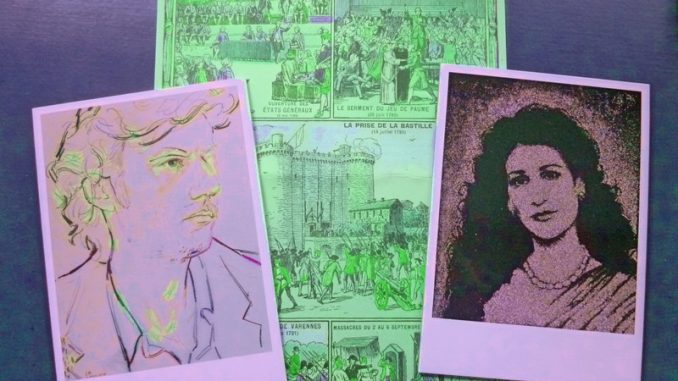 Hintergrund: historische Grafik mit Szenen und Köpfen der Französischen Revolution