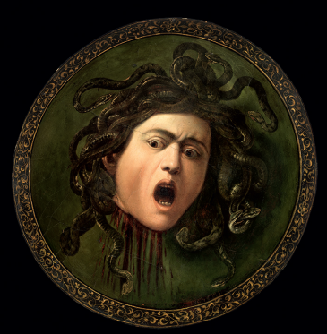 Mit ihrem makabren Gesichtsausdruck, ihren Haaren aus lebendigen Schlangen und dem am Hals herausspritzenden Blut zählt diese Darstellung zu den unheimlichsten und zugleich beeindruckendsten Werken des Künstlers. Selbst nach der Enthauptung durch den Helden Perseus war der Kopf der Gorgo Medusa noch gefährlich: Ein Blick in ihre Augen oder die der Schlangen genügte, um den Betrachter in Stein zu verwandeln. Damit war es ein ideales Motiv für ein Schild zur Abwehr des Gegners.