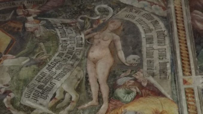 Das Fresko zeigt neben zahlreichen Szenarien die augenscheinlich nackte Eva, die von der Schlange den Apfel der Versuchung gereicht bekommt und wie sie ihrerseits drei verzweifelten Menschen einen Totenkopf reicht.