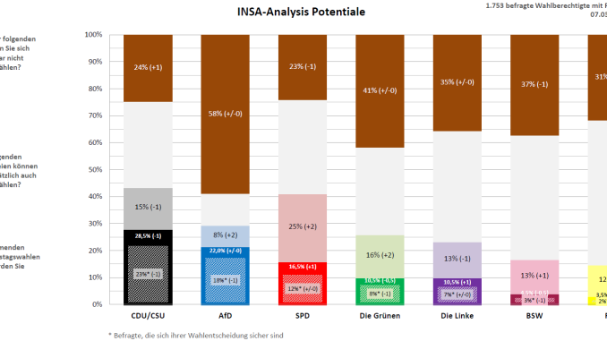 Bei den potentiell erreichbaren Wählern legt das BSW einen und die AfD, die SPD sowie die Grünen jeweils zwei Prozentpunkte zu, wohingegen hier die Union, die Linke sowie die FDP jeweils einen Prozentpunkt verlieren.