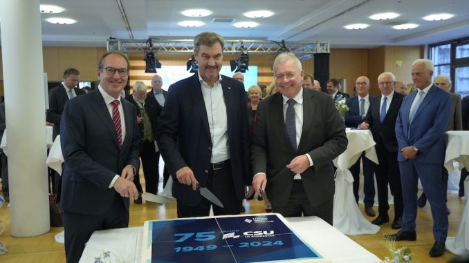 CSU-Landesgruppenvorsitzender Alexander Dobrindt, MdB, CSU-Vorsitzender Dr. Markus Söder, MdL und Gastgeber Markus Ferber, MdEP schnitten gemeinsam die Jubiläums-Torte „75 Jahre CSU im Bundestag“ an. Das erste Tortenstück erhielt Dr. Theo Waigel, ehemaliger Landesgruppenchef (1982-1989) und CSU-Vorsitzender (1988-1999).