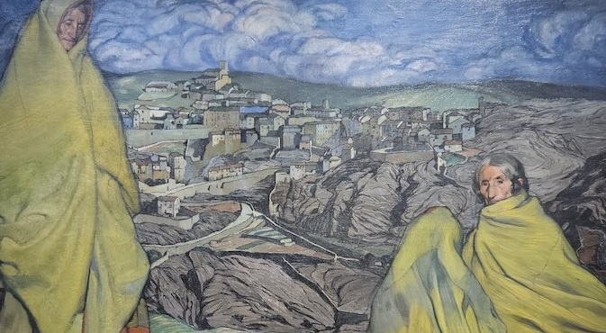 Das Trio aus Sepúlveda ist in gleiche gelbgrüne Tücher gehüllt. Nur eine der Frauen blickt den Betrachter direkt an. Ihre Nachbarin sieht an ihr vorbei, in die Ferne: auf den kastilischen Ort Sepúlveda, der vermutlich allein durch Zuloagas imposantes Bild Weltberühmtheit erlangte. Die dritte Frau steht aufrecht, wendet sich von der Ansiedlung ab, über der sich Wolken unheilvoll verdichten, scheint ängstlich zu sein, aber gefasst und sicher, mit dem, was vielleicht in den nächsten Minuten passiert, fertigzuwerden. Wir teilten, so die Kuratorin, auf diese Weise den „doppelten Blick“ des Malers auf seine langjährige Heimat. Er nähme „als Spanier eine Innenperspektive ein, schaut aber durch seine langen Paris-Aufenthalte und vielen Reisen auch mit Distanz auf das Land“.