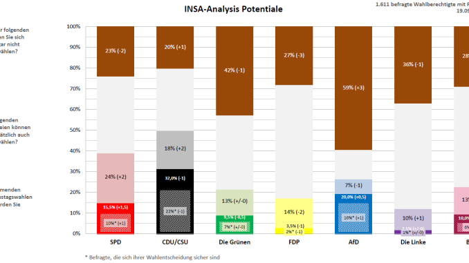 Den Anteil an potentiellen Wählern kann in dieser Woche die Linkspartei sowie das BSW jeweils um einen und die SPD sowie die CDU/CSU jeweils um zwei Prozentpunkte erhöhen, während die AfD hier einen und die FDP zwei Prozentpunkte einbüßt. Einzig das Potential der Grünen bleibt konstant.