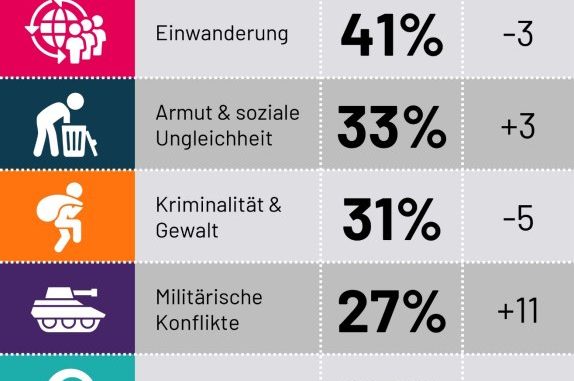 Das Thema Migration bereitet 41 Prozent der Deutschen Sorgen und steht damit zum sechsten Mal in Folge an der Spitze des Rankings, auch wenn es seit Februar leicht an Bedeutung verloren hat (-3 Prozentpunkte). Im weltweiten Vergleich liegt Deutschland bei der Sorge um Zuwanderung knapp hinter Chile (44 %) auf Platz zwei, mit einigem Abstand folgen andere europäische Länder wie Großbritannien (32 %) und Frankreich (27 %) sowie die USA (25 %).