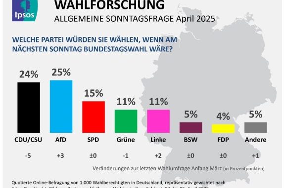 Während die Koalitionsverhandlungen über eine schwarz-rote Bundesregierung zum Abschluss kommen, verliert die Union nach ihrem Kurswechsel in der Schuldenpolitik massiv an Vertrauen. Im aktuellen Sonntagstrend des Markt- und Meinungsforschungsinstituts Ipsos rutschen CDU und CSU um fünf Prozentpunkte auf 24 Prozent ab – der niedrigste Wert seit drei Jahren. Profitieren kann vor allem die AfD, die im Vergleich zur letzten Wahlumfrage Anfang März drei Prozentpunkte zulegt und mit 25 Prozent die Union überholt. Erstmals führt die AfD die Sonntagsfrage als stärkste Kraft an. Für die SPD würden sich unverändert 15 Prozent (±0) der Wahlberechtigten entscheiden, während die Grünen leicht in der Wählergunst verlieren. Mit 11 Prozent der Stimmen (-1) liegen sie nun gleichauf mit der Linken, die erneut zwei Prozentpunkte hinzugewinnt und ihren Höchstwert seit Dezember 2016 erreicht.