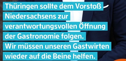 Auch für Thüringen fordern wir weitere Lockerungen: Ab kommenden Montag soll die Gastronomie im Innen- und Außenbereich wieder öffnen können, schlägt unser parlamentarischer Geschäftsführer Andreas Bühl vor. Notwendig sind natürlich die Einhaltung der Abstands- und Hygieneregeln. Wir wollen, dass unsere Gastronomen nicht auf die umsatzstarken Feiertage der kommenden Wochen verzichten müssen.