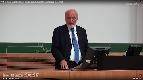 Prof. Dr. Dr. h.c. mult. Hans-Werner Sinn sprach auf Einladung von Prof. Dr. Gunther Schnabl am 20. Juni 2017 an der Universität in Leipzig im Rahmen der „Leipziger Wirtschaftspolitischen Gespräche“. Das Thema: „Europa in der Krise“. In seinem Vortrag setzt sich Hans-Werner Sinn kritisch mit einer zentralisierten Europäischen Union auseinander. Er erklärt, warum die Europäische Union – in ihrer jetzigen Form – keine Zukunft haben wird. Die EU Verträge müssten neu verhandelt werden, weil sich nach dem Austritt des Vereinigten Königsreichs die Mehrheiten im Europäischen Rat zugunsten der Südländer verschieben werden. „Und sie werden es auch „, so Sinn. Hans-Werner Sinn kritisiert auch die Geldpolitik der Europäischen Zentralbank. Die EZB kauft seit Beginn 2015 in riesigem Umfang Wertpapiere. Bis Ende dieses Jahres werden es Wertpapiere für 2300 Milliarden Euro sein, davon für 1800 Milliarden Euro Staatsanleihen und für 500 Milliarden private Wertpapiere wie Unternehmensanleihen. Das sei viel Geld. Sein Vergleich: 1800 Milliarden hätten 600 Transrapid-Strecken vom Münchner Flughafen zum Münchner Hauptbahnhof gekostet. Das Wertpapierankaufprogramm (Quantitative Easing) der Europäischen Zentralbank sei eine gewaltige Umschuldungsaktion zugunsten überschuldeter Euro-Länder und gehe zu Lasten der deutschen Bürger. Hans-Werner Sinn ist emeritierter Professor der Ludwig-Maximilians-Universität München. Er war von 1999 – 2016 Präsident des ifo Instituts für Wirtschaftsforschung. Er gründete und leitete das internationale Forschernetzwerk CESifo. In den letzten Jahren beschäftigte er sich vor allem mit dem Euro, Griechenland, der europäischen Geldpolitik (TARGET-Salden), grüner Energie, der Demographie und der Migration. Zuvor hatte er sich der deutschen Wiedervereinigung, dem Steuerwesen, der Bankenregulierung und dem Versicherungswesen gewidmet. Hans-Werner Sinn ist einer der einflussreichsten Ökonomen in Deutschland und Europa. aktuelle Bücher: „Der Schwarze Juni: Brexit, Flüchtlingswelle, Euro-Desaster – Wie die Neugründung Europas gelingt“ http://amzn.to/2ikviS4 „Auf der Suche nach der Wahrheit: Autobiografie“ http://amzn.to/2kl4Hs4