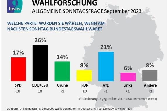 Pressemitteilung – Wenn am nächsten Sonntag Bundestagswahl wäre, würden unverändert 26 Prozent der Wahlberechtigten CDU/CSU wählen. Die AfD bleibt mit 21 Prozent weiterhin zweitstärkste politische Kraft im Land, verliert nach dem Höhenflug der letzten Monate jedoch zum ersten Mal seit März wieder leicht an Zuspruch (-1). Für die SPD würden sich wie schon im Vormonat 17 Prozent der Wahlberechtigten entscheiden. Die Grünen verlieren leicht in der Wählergunst und kommen auf 14 Prozent (-1). Die FDP bleibt konstant bei 8 Prozent der Stimmen, die Linkspartei verbessert sich leicht und liegt nun wieder bei 6 Prozent (+1). Die sonstigen Parteien können 8 Prozent (+1) der Stimmen auf sich vereinen.
