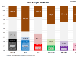 Die Union (26,5 %) verliert in dieser Woche einen halben Prozentpunkt, führt aber die aktuelle Potentialanalyse nach wie vor an. Darauf folgt unverändert die AfD mit 23,5 Prozent. Auf Platz drei kommt die SPD mit 15,5 Prozent, die einen Prozentpunkt zulegt. Die Grünen (12 %), die Linke (10,5 %), das BSW (4,5 %) sowie die FDP (3,5 %) bleiben jeweils konstant. […]