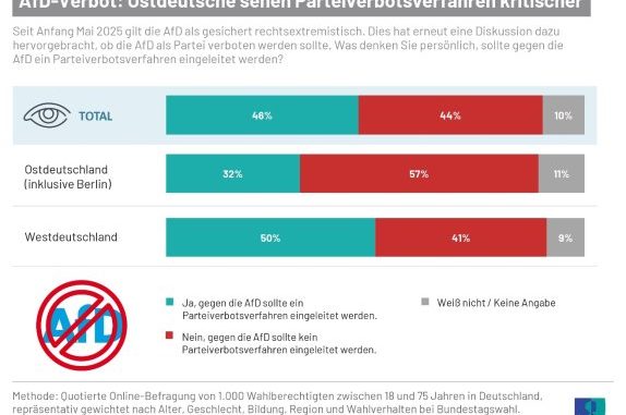 Ostdeutsche stehen einem Verbotsverfahren gegen die AfD deutlich kritischer gegenüber als Menschen in Westdeutschland. In den ostdeutschen Bundesländern würde weniger als ein Drittel (32 %) der Befragten ein Verbotsverfahren gegen die AfD begrüßen. Eine Mehrheit von 57 Prozent lehnt es ab. Im Westen hingegen befürwortet die Hälfte (50 %) der Befragten ein Verbotsverfahren, während sich 41 Prozent dagegen aussprechen.