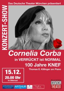 Am 15. Dezember steht Cornelia Corba im Deutschen Theater/ Silbersaal mit der Konzert-Show „Verrückt ist normal“ eine Hommage zum 100. Geburtstag von Hildegard Knef, auf der Bühne. Diese Konzert-Show entstand durch ihre Freundschaft zu zwei Musiklegenden. Gert Wilden, ihr Mentor, war einer der erfolgreichsten Filmkomponisten der Nachkriegszeit und der erste deutsche Produzent von Hildegard Knef. Hans Hammerschmid, ihr Berater und guter Freund, war der jahrelange Produzent und Komponist vieler der schönsten Knef Lieder u.a. “ Für mich solls rote Rosen regnen“. Aus den Erzählungen der beiden Freunde entstand KI begleitet diese Konzert-Show. Sie wurde bereits in der evangelischen Akademie im Schloß Tutzing mit großem Erfolg gezeigt. Wolfgang Hammerschmid, der Sohn des Komponisten sagte „Riesenerfolg, Kompliment und Gratulation.“
