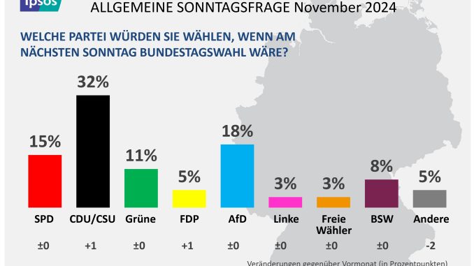 Nach dem Bruch der Ampelkoalition strebt Bundeskanzler Olaf Scholz Neuwahlen im März 2025 an. Zum jetzigen Zeitpunkt kann die Union mit einem deutlichen Wahlsieg rechnen, wie eine aktuelle Ipsos-Wahlumfrage vom 1. und 2. November zeigt. Wenn am nächsten Sonntag Bundestagswahl wäre, würden 32 Prozent der Wahlberechtigten der Union ihre Stimme geben – ein Prozentpunkt mehr als im Vormonat. CDU und CSU erhalten damit mehr Zustimmung als alle drei Ampelparteien zusammen.