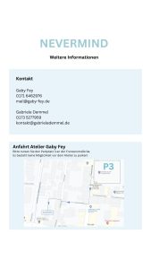 Pressemitteilung – Parallel zur Art Cologne geben Unterwasser-Fotokünstlerin Gaby Fey und die Malerin Gabriele Demmel unter dem Titel „NEVERMIND“ in Gaby Feys zweistöckigem Atelierhaus „AquaVision“ in Erftstadt Lechenich einen Einblick in ihr Schaffen. Die Künstlerin schwärmt von den gerade neubezogenen Räumen: „Es war Liebe auf den ersten Blick! Ich war sofort geflasht von dem versteckt liegenden, beinah verwunschenen Gemäuer und seiner künstlerischen Energie. Seit über zwanzig Jahren wird in diesem Atelierhaus Kunst gemacht.“