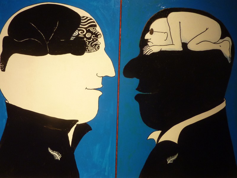 Nur eine dünne rote Linie – aber Maori und Pakehar sind getrennt – jeder mit seinem Gegenüber im Kopf. Helme Heines Karikaturen von 2018 geben zu denken.
