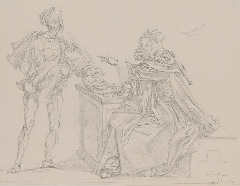 Werner Tübke: Verarmter Adeliger bringt Zinsgroschen, 1976, Bleistift, 30,5 x 39,5 cm