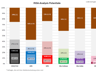 Die Union (25 %) legt in dieser Woche einen halben Prozentpunkt zu und führt somit die aktuelle Potentialanalyse wieder knapp vor der AfD mit 24,5 Prozent an. […]