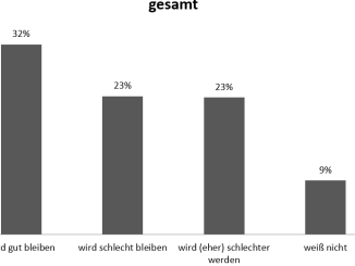 Knapp ein Drittel der Umfrageteilnehmer (32 %) vermutet, dass ihre eigene wirtschaftliche Situation im Laufe des Jahres gut bleiben wird. Jeweils 23 Prozent gehen wiederum davon aus, dass sie schlecht bleiben oder (eher) schlechter werden wird. Lediglich elf Prozent erwarten eine Verbesserung. Neun Prozent wissen es nicht und zwei Prozent machen hierzu keine Angabe. […]
