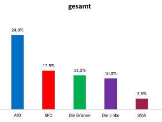 Die Union (27,5 %) bleibt in dieser Woche konstant, während die AfD (25 %) einen Prozentpunkt hinzugewinnt. Dahinter folgen unverändert sowohl die SPD (14,5 %) als auch die Grünen (10,5 %) und die Linkspartei (9,5 %), welche einen halben Prozentpunkt verliert. Das BSW (4,5 %) behält seinen Vorwochenwert und die FDP (3 %) büßt einen halben Prozentpunkt ein. […]