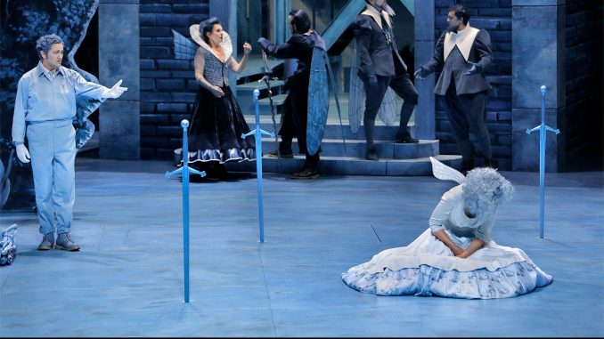 Gewiss doch: Musiker und Sängerensemble verdienen allerhöchsten Respekt. Aber mit der Bühne dieser Neuproduktion, mit der die Richard Wagner-Festspiele `18 eröffnet wurden, muss man als bei 33 Grad schwitzender Zuschauer erst mal fertigwerden. Nicht mit den multi-blauen bedrohlichen bis friedlichen Riesengemälden, dem spaßigen Elektro-Transformatoren-Gedöns in märchenhaft surrealistischen Gefilden und dem wunderlichen Blitzgezucke des Leipziger Star-Malers Neo Rauch (ohne Schülertheater-Schiebe-Teile ging es leider nicht ab, auch nicht ohne ein Klaustrophobie suggerierendesa Apricot-Brautgemach), sondern mit den Kostümen von Rauchs Gattin Rosa Loy: Sie verpasste den ganz in Delfter Barock-Manier Gekleideten (Chor und Brautjungfern, dicklich und volkstümlich) neckische Insektenflügel. Seine beide hängt Lohengrin Pjotr Beczala, der beherzt Roberto Alagna drei Wochen vor Endtermin ersetzte und einen wonnigen Gralsritter im Blaumann und Gelegenheits-Silberpanzer abgab, von Elsa enttäuscht an den Garderobehaken. Wie neckisch. Wie einfallsreich? Was bringen solche entomologischen Anspielungen außer Rätselratereien?