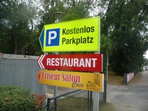 Renata arbeitet der Kinder wegen in Teilzeit und verdient relativ gut, sagt sie, manchmal 700 Euro netto, was in etwa dem Vollzeitlohn in einem polnischen Supermarkt entspricht. „Unsere Sprachen sind ähnlich, Polnisch und Weißrussisch“, erklärt Renata, warum es sie schon vor Jahren hierher verschlagen habe; wie viele ihrer Landsleute, die vor der Diktatur und Armut geflohen sind und nun fürchten, in Putins Krieg mithineingezogen zu werden; ebenso Usbeken, Georgier und Albaner, die mit Gartenmöbeln, einem Ölwechsel ohne Voranmeldung und preiswerten Mahlzeiten um deutsche Kunden buhlen. Manche der Händler sprechen Englisch, erstaunlich viele gut Deutsch, was sich in Osteuropa durch nahezu alle Bevölkerungsschichten beobachten lässt. „Futtern wie bei Muttern“ steht in Lettern über einer Imbissbude, daneben ein Parkplatz für die Fernbusse aus Berlin und Hamburg, die regelmäßig hier Halt machen.