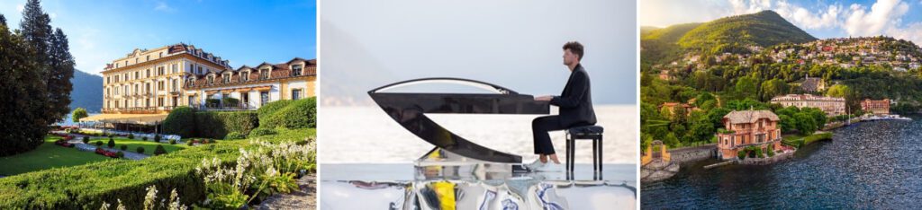 Nur einige Schritte zu Fuß von der Villa d’Este entfernt, befindet sich der besondere Spielort: Das Klavier von Alessandro Martire steht auf einer mobilen schwimmenden Plattform, die von einem Elektroboot gezogen wird und die Musik direkt auf das Wasser des Comer Sees bringt. Ein musikalischer Spaziergang, den Zuhörer vom gesamten Seeufer in Cernobbio mit weitem Blick über das sanfte, tiefblaue Wasser genießen können.