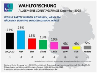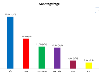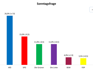 Die Union (25 %) verliert in dieser Woche einen halben Prozentpunkt, während die AfD (26 %) einen halben Punkt zulegt, somit liegt die AfD wieder vor der Union. […]