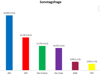 Die Union (24,5 %) verliert in dieser Woche einen halben Prozentpunkt, während die AfD (26 %) unverändert bleibt. Somit kann die AfD ihren Abstand zur Union weiter ausbauen. […]