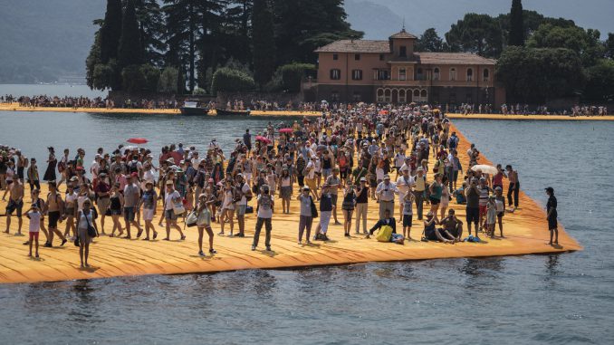 Vor dem malerischen Bergpanorama der italienischen Alpen realisierte der legendäre Installationskünstler Christo 2016 auf dem Lago d‘Iseo seine „Floating Piers“. Mit leuchtend gelben Stoffbahnen bespannte Stege aus schwankenden Pontons verbanden die beiden Inseln Monte Isola und San Paolo mit dem Ufer und zeichneten ein abstraktes Kunstwerk in die Landschaft. Das Werk existierte nur für 16 Tage, ermöglichte es aber über 1,2 Millionen Besuchern auf dem Wasser zu laufen.