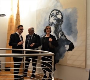 Das Thema der Reise zieht sich auch wie ein roter Faden durch die Schau in den Werken des Kommunikationsdesigners und Fotografen Sebastian Krawczyk aus Niedersachsen. Neben mancher Fotoarbeiten, die dank ihrer „pinselartigen Strukturen“ an einem Grenzgebiet zwischen Fotografie und Malerei angesiedelt sind, wirken andere wie unscharfe Zeugnisse an Traumfahrten in südliche Regionen, wo die Farben Blau und Gelb die Wärme des Sandes und die Nähe des Meeres verspüren lassen. In anderen noch sind mit der Kamera dokumentierte Reiseimpressionen aus fernen Ländern von Armenien bis zum Polarkreis festgehalten. Beeindruckend die Serie, die Krawczyk Jerusalem widmet, in der die Heilige Stadt nicht – wie sonst oft üblich – als konfliktreichen Schauplatz kriegerischer Auseinandersetzungen, sondern als Treffpunkt der verschiedenen Ethnien und Religionen dargestellt wird. „Last Icon“ heißt schließlich ein Bild mit beinah magnetischer Anziehungskraft, das die Aura einer Christusgestalt trägt und sich allein im letzten Raum Krawczyks Jerusalem-Serie gesellt. Es zählt zu der „Caputology“ genannten Reihe von teils mit Titel, teils namenlosen Gemälden des jungen Münchner Malers Simon von Barloewen, die nicht nur durch die großen Formate oder durch ihre Farbigkeit ins Auge stechen, sondern eher durch ihre enigmatische Ausstrahlung. Schon aus der Ferne lenken sie die ganze Aufmerksamkeit auf sich und entfesseln peu à peu ihre katalysierende Wirkung, am besten bei einem Perspektivenwechsel, wenn man sich die Schau nochmals rückwärts ansieht. Ihre Wandelbarkeit überrascht immer wieder aufs Neue, ohne je den Rätsel preiszugeben, der ihnen inne wohnt. Hypnotisierend wirken sie auf den Betrachter mit der Intensität ihrer Blicke, mit dem Ausdruck der Augen, die ihn durch den ganzen Raum verfolgen wie getränkt in einem Meer von Tristesse oder von einer Sehnsucht getrieben, die nie gestillt werden kann. Als „faszinierende Kopfgeburten“ bezeichnete die Münchner Presse die Bilder, als sie vor einigen Monaten im Kunstraum FLO zu sehen waren, und verwies dabei zurecht auf den Einfluss von Größen der Malerei wie Francis Bacon oder Lucien Freud und Otto Dix. Die farbenkräftigen, mal feuerroten mal ins Blaue abgleitenden, mit sicherem Strich gemalten Köpfe sind in der Tat keine Porträts, sondern Seelenlandschaften, die es langsam zu entdecken und zu erkunden gilt. Figürliche Werke auf dem Weg in die Abstraktion, unheimlich und geheimnisvoll in ihrer Aussage, wie die auch etwas rätselhaften mit schwarzer Tusche scheinbar rasch angefertigten Skizzen, die ein geglücktes Pendant zu den Gemälden bilden. Für den begabten Absolventen der Freien Werkstätte München und Studierenden der Münchner Kunstakademie mit bereits mehreren Ausstellungsbeteiligungen europaweit stellt diese Schau einen kleinen Höhepunkt in einer Laufbahn, die sich als vielversprechend ankündigt. Eine sehenswerte Ausstellung der Extraklasse mit Werken unterschiedlicher Art und Inspiration, die ein harmonisches Ganzes vor einer außergewöhnlichen Kulisse zusammenfügt. Zu sehen bis zum 28.11.2017 am Prinzregentenplatz 23 täglich zwischen 15:00 und 20:00 Uhr.