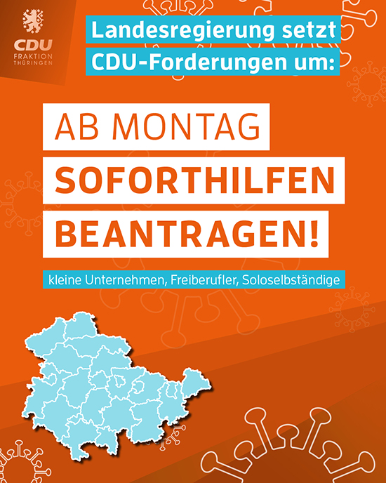 Es kommt Bewegung in die Hilfe für Thüringer Unternehmen. Bereits am Mittwoch haben wir unsere Forderungen präsentiert, heute setzt die Landesregierung einen Teil unseres Konzepts um. Ab Montag können Unternehmen endlich erste Soforthilfen beantragen, das Antragsformular wird dann online gestellt. Die Fördersumme beträgt bis zu 30.000 Euro und gilt für kleine Unternehmen, Freiberufler und Soloselbstständige.