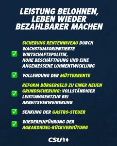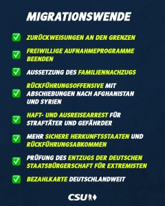 Als CSU konnten wir unter Führung unseres Parteivorsitzenden und Ministerpräsidenten Dr. Markus Söder in den Verhandlungen zentrale Forderungen durchsetzen und sind die ersten Schritte zu einem echten Politikwechsel gegangen, insbesondere bei den Themen Migration und Wirtschaft. Denn wir wollen Deutschland wieder in Ordnung bringen.