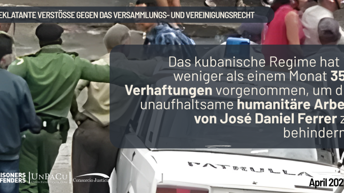 Am 28. März brachen drei betrunkene Personen auf Anweisung der politischen Polizei in die UNPACU-Zentrale ein. Dort beleidigten und schubsten sie viele ältere Menschen in der Suppenküche. Eine der Personen traf in der Schlange vor der Suppenküche auch auf seine Frau, die er vor all den dort wartenden schutzbedürftigen Menschen, älteren Menschen und Kindern grausam ohrfeigte. Trotz der Tatsache, dass die politische Polizei Kameras auf die Warteschlange und den Eingang des UNPACU-Hauptquartiers gerichtet hat, konnte die Person diese Gewalt gegen die Frau ungestraft ausüben, ohne dass dies Konsequenzen hatte und ohne dass die Behörden die Person trotz der Tatsachen verhafteten, wodurch die Aggression des Regimes gegen die wehrlose Frau institutionell geschützt wurde.