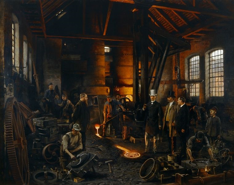 Hans W. Schmidt, Großherzog Carl Alexander von Sachsen-Weimar-Eisenach in der Eisengießerei Stieberitz in Apolda, Öl auf Holz, 1889, Dauerleihgabe Sammlung I. H. Prinzessin Leonie von Sachsen-Weimar-Eisenach, Klassik Stiftung Weimar