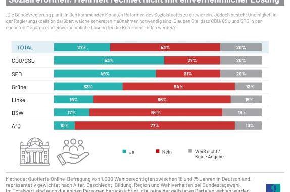 Im Osten zweifeln mehr Befragte daran, dass sich die schwarz-rote Koalition in den kommenden Monaten auf Reformvorschläge einigen wird. Nur 18 Prozent der Ostdeutschen glauben, dass die Regierung eine einvernehmliche Lösung bei der Reform des Sozialstaats finden wird, fast zwei Drittel (64 %) rechnen nicht damit. Im Westen hingegen sind 29 Prozent der Befragten der Meinung, dass sich Union und SPD einigen werden. Etwa die Hälfte (51 %) erwartet jedoch auch hier keine Einigung.