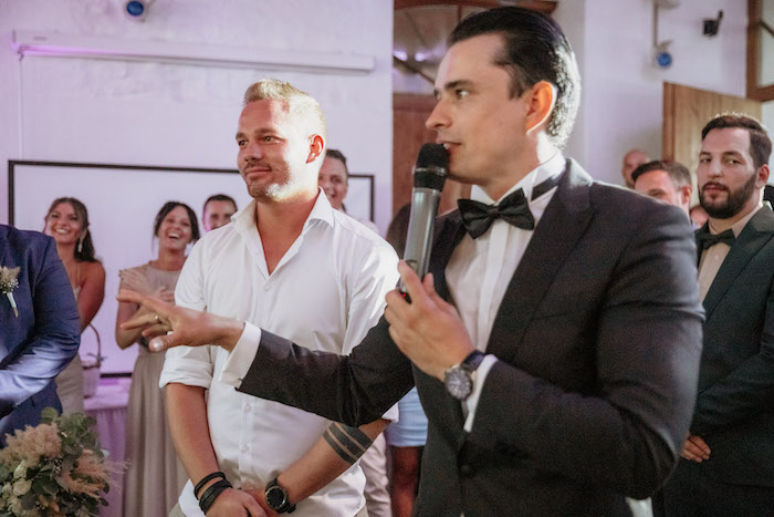russische Tamada feiert eine Hochzeit mit den Gästen Russische Tamada feiert eine Hochzeit mit den Gästen Drucken