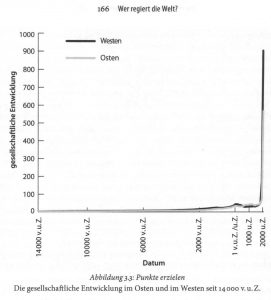 Die Philosophie sollte nicht als das Bauen abgehobener, völlig erfahrungs- und weltfremder Ideengebäude verstanden werden, sondern sie sollte versuchen, aufgrund einer tieferen Kenntnis von Sein und Welt die menschliche Existenz im jeweiligen Entwicklungsstadium zu ergründen, zu deuten und darin eine praktisch verwendbare Orientierung zu geben. Diese Aufgabe fordert die Philosophie besonders in der heutigen Zeit heraus, denn in der menschlichen Entwicklung ist seit ca. 200 Jahren ein Umbruch im Gange, der alle bisherigen Umbrüche der Menschheit wie dem der neolithischen Revolution weit in den Schatten stellt, der darin noch lange nicht abgeschlossen ist und mit einem völlig offenen Ende sowohl zu einem Paradies auf Erden als auch zum Untergang der Menschheit führen kann. So sieht es zumindest der Archäologe und Historiker Ian Morris, der die gesellschaftliche oder kulturelle Entwicklung des Menschen seit der letzten Eiszeit systematisch untersucht und in dem folgenden Diagramm sowohl für den Osten (China) als auch den Westen dargestellt hat (vgl. Ian Morris, „Wer regiert die Welt“, Frankfurt/M. 2011, S. 166). Die Kurve der technisch-materiellen Entwicklung explodiert seit der Befreiung der Ideen in der Aufklärung, der Entstehung der modernen Naturwissenschaft und der industriellen Revolution vor ca. 200 Jahren geradezu – genauso wie die der Bevölkerungsentwicklung, beide Kurven sind in dem gewählten Zeitraum von ca. 16.000 Jahren praktisch identisch.