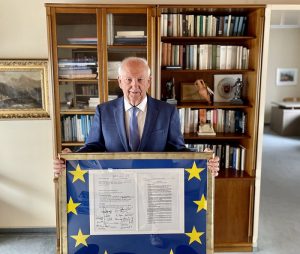 Ingo Friedrich ist Europapolitiker der ersten Generation. 1979 wurde er in das Europäische Parlament gewählt. Heute, 40 Jahre später, brennt er nach wie vor für Europa. Betreten Besucher die beiden Büros des Europäischen Wirtschaftssenats in Brüssel oder München, werden sie unmittelbar von der Europaflagge begrüßt. Sie hängt unübersehbar über seinem Schreibtisch. Die Flagge ist eine der größten Erfolge seiner Laufbahn. Viele Menschen wissen aber gar nicht, wie es zu diesem Symbol kam.