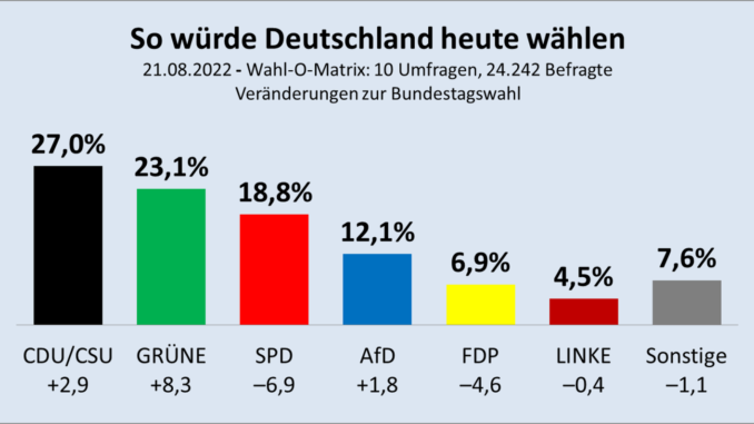 - Kantar/Emnid (FOCUS), mittlerer Tag der Befragung: 13.08.2022, telefonische Befragung von 1.429 zufällig ausgewählten Personen,