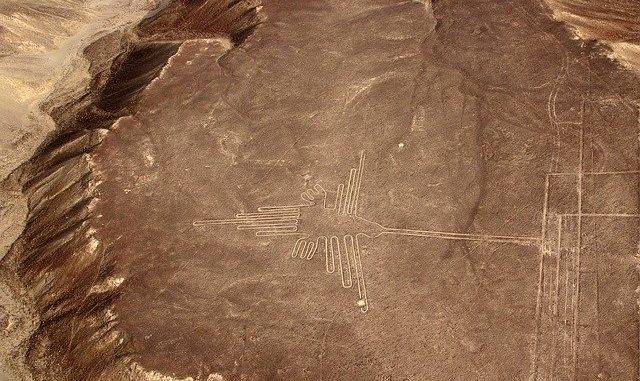 Zwischen den peruanischen Städten Nazca und Palpa finden sich auf einem Gebiet von rund 500 Quadratkilometern riesige Geoglyphen, besser bekannt als „Nazca-Linien“. Dazu gehören Dreiecke, trapezförmige Formationen und bis zu 20 km lange, schnurgerade Linien. Auch Abbilder von Menschen, Affen, Vögeln und Walen finden sich hier. Oft sind die figurbildenden Linien nur wenige Zentimeter tief. Die Schöpfer der Bilder haben das „Wüstenlack“ genannte, dunkle Gestein an der Oberfläche entfernt, ein rostrotes Gemisch aus Eisen– und Manganoxiden. Dadurch tritt der sandfarbene und meist weichere Untergrund offen zu Tage. Wegen ihrer enormen Ausdehnung sind die Geoglyphen jedoch nur aus größerer Höhe zu erkennen, etwa von Flugzeugen oder Hubschraubern aus. Die Geschichte ihrer Entdeckung begann 1924, als erste kommerzielle Flugzeuge über das Plateau von Nazca flogen, deren Passagiere die merkwürdigen Bilder in der Wüste ausmachten.