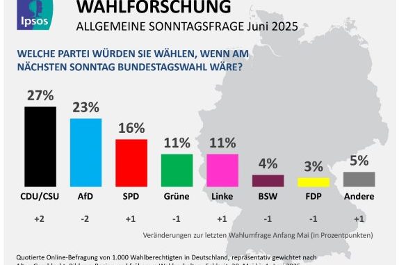 Knapp einen Monat nach Amtsantritt der schwarz-roten Koalition steigt die Zustimmung zu den Regierungsparteien. Im aktuellen Sonntagstrend des Markt- und Meinungsforschungsinstituts Ipsos gewinnen CDU und CSU im Vergleich zur letzten Wahlumfrage im Mai zwei Prozentpunkte hinzu und erreichen wieder 27 Prozent. Die AfD hingegen verliert in der Wählergunst und liegt nur noch bei 23 Prozent (-2) der Stimmen. Die Union baut damit ihren Vorsprung vor der AfD wieder aus, die im April zum ersten Mal in einer bundesweiten Umfrage als stärkste Kraft hervorgegangen war. Auch die Sozialdemokraten können wieder zulegen: Für die SPD würden sich aktuell 16 Prozent der Wahlberechtigten entscheiden, ein Prozentpunkt mehr als noch im Vormonat. Grüne und Linke liegen mit jeweils 11 Prozent der Stimmen in der Sonntagsfrage wieder gleichauf. Während die Linkspartei sich um einen Prozentpunkt verbessert, müssen die Grünen leichte Einbußen (-1) hinnehmen.