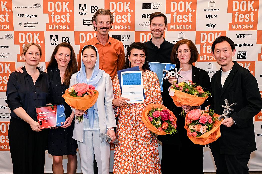 Die Gewinner*innen bei der Hauptpreisverleihung am Samstag (v.l.): Katrin Nemec, Katharina Köster (Regisseurinnen JENSEITS VON SCHULD), Freshta Khawari (Protagonistin KAMAY), Festivalleiter Daniel Sponsel, Bahar Bektaş (Regisseurin EXILE NEVER ENDS), Andreas Hartmann (Co-Regisseur JOHATSU), Rebecca Hirneise (Regisseurin ZWISCHEN UNS GOTT) und Arata Mori (Co-Regisseur JOHATSU) (c) DOK.fest München / Ronny Heine