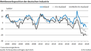 Die Wettbewerbsposition der deutschen Industrie innerhalb der EU und auf den Weltmärkten verschlechtert sich seit zwei Jahren. Das geht aus Auswertungen der monatlichen ifo-Umfrage hervor. Innerhalb der EU berichteten die Unternehmen seit dem dritten Quartal 2022, dass sie bei der Wettbewerbsposition zurückfallen. Ähnliches gilt auf den Weltmärkten (ohne EU), wo diese Entwicklung schon im ersten Quartal 2022 begonnen hatte. „Für die deutsche Industrie wird es schwieriger, sich im Wettbewerb zu behaupten“, sagt Klaus Wohlrabe, Leiter der ifo-Umfragen.