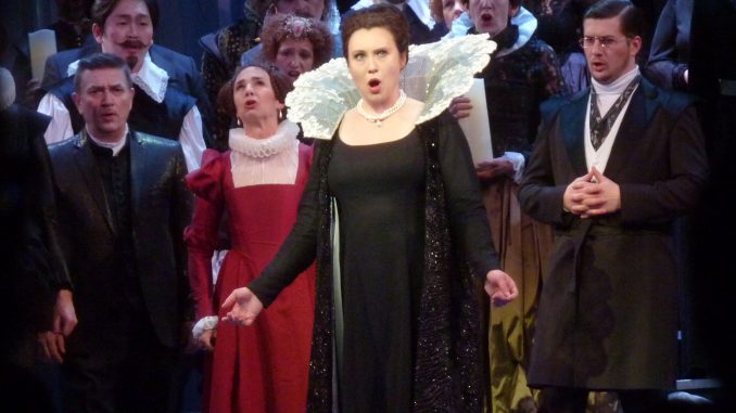 Zweifellos passte das Bühnenambiente grundsätzlich zur Kühle, Grausamkeit und Tyrannei der physiognomisch und kostümiert der historischen Figur Elisabeth I. von England aufs Haar gleichenden Figur der Titelheldin-Gegnerin. In Rolle und Habitus faszinierte, auch stimmlich, die geborene Chemnitzerin Nadja Stefanoff als Elisabetta I. Schon Friedrich Schiller zweifelte in seinem Sprechstück „Maria Stuart“ an der historischen Belegbarkeit des Zusammentreffens der beiden königlichen Rivalinnen, und so geriet auch dieser Top-Moment nicht unbedingt zur ergreifendsten Szene des Abends. Den ließen Sturminger und Bramall den Soli ihrer (wie schon als Nachtwandlerin) großartigen Hochdramatischen, die sie für die Titelpartie gewinnen konnten: die Amerikanerin Jennifer O`Loughlin. Ihr Gebet, ihre Abdankung, ihr Schuld-Eingeständnis, ihre kurze Ohnmacht vor dem Opfergang zum Schafott, ihr Verzicht auf die Liebe des auch von Elisabetta begehrten Grafen Leicester (gut aussehend, aber zu scharf intonierend und kaum berührend: der Rumäne Lucian Krasznec) – die O`Loughlin wusste darstellerisch und mit einem beispielhaft leuchtenden Sopran ihre Chancen zu nutzen und konnte als Maria voll überzeugen.