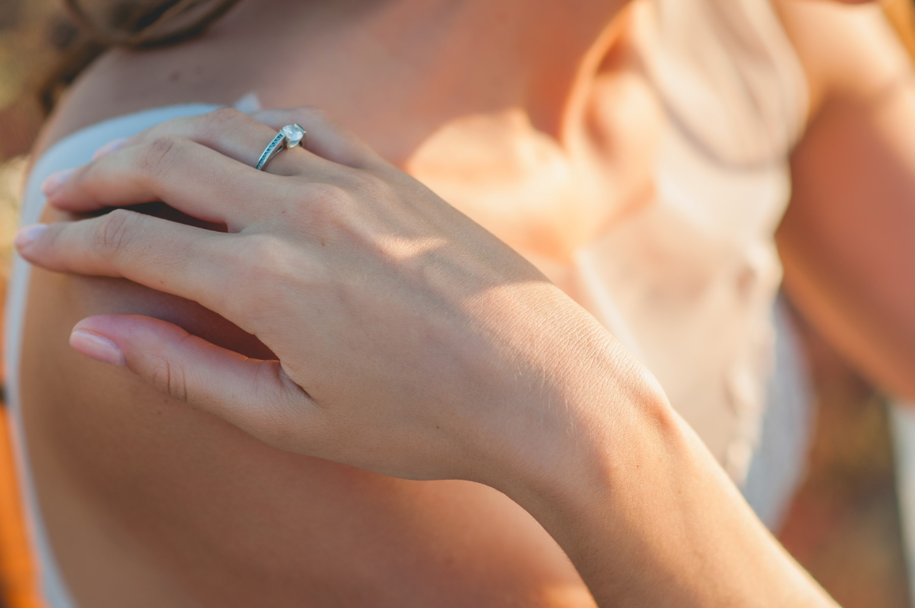 Close-up of Engagement Ring on Shoulder A close-up shot of a woman’s hand with an engagement ring resting on her shoulder, showcasing the ring in a romantic setting. Drucken
