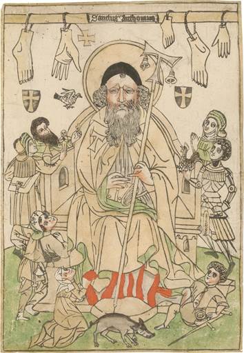 Der Hl. Antonius, um Hilfe gebeten von an Mutterkornvergiftung Erkrankten Süddeutschland (Schwaben?), um 1450 Holzschnitt, alt koloriert, 382 x 264 mm (Blatt) Inv.-Nr. 118241 D © Staatliche Graphische Sammlung München