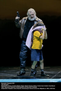Im ersten Akt der „Walküre“ ist Sieglinde bereits schwanger. Also Siegmund kann der Vater nicht sein. Nach einer späteren Szene, in der Wotan Sieglinde unter den Rock greift, lässt sich vermuten, dass es Wotan ist. Endgültig geklärt wird das nicht. Das wäre dann ein Missbrauch „on Top“! Und Brünnhilde wäre die Halbschwester von Siegfried. Im ersten Akt der „Walküre“ wie auch im letzten, bei „Wotans Abschied“, zeigt sich deutlich, dass Valentin Schwarz mit dem Thema Liebe, das bei Wagners Ring eine so versöhnliche Rolle spielt, nichts im Sinn hat. Das zeigt sich auch dann, wenn Siegmund die berühmte Arie der „Winterstürme“ links, fast in der Ecke der Bühne singt. Für Besucher, die in Reihe 25 links am Rand sitzen, ist er nicht zu sehen. Und die mit ungelenkem Gang einer hochschwangeren treppensteigenden Sieglinde stört die sonst in diesem Akt zunehmend aufgeladene Atmosphäre von Liebe und Leidenschaft, Außerdem ist Hunding in dieser Szene länger präsent als in anderen Inszenierungen, Er sitzt im Vorgrund der Hütte inmitten der abgestorbenen verknorpelten Äste der Weltesche.