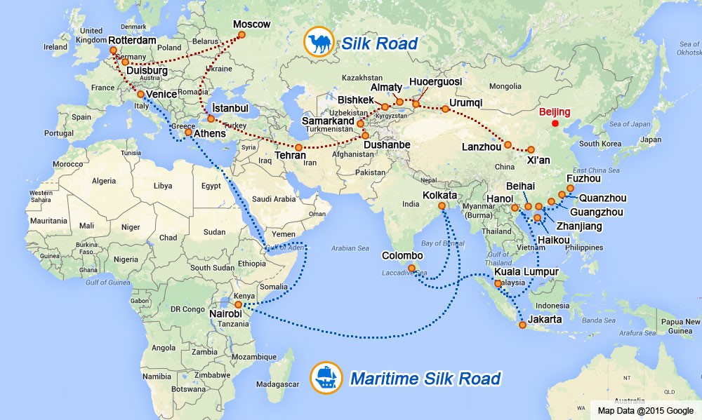 Abb. 1_Seidenstraße (rot) und maritime Seidenstraße (blau) Abb. 1_Seidenstraße (rot) und maritime Seidenstraße (blau) Drucken