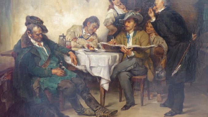 Ob der aus Hannover stammende, 1946 14jährig in die oberbayerische „Stadt im Grünen“, Waldkraiburg, geflüchtete spätere Unternehmer Peter Schmidt eine Vorliebe für bayerische Wirtshäuser hegte? Die Szene des Bildes, das ihn zum Sammeln sogenannter Genremalerei des späten 19. Jahrhunderts anregte, spielt jedenfalls in einem Wirtshaus. Ein junger Maler porträtiert einen dösenden alten Haudegen und lässt sich dabei gerne zuschauen. Die „ ganze G`schicht“ brachte der Württemberger Friedrich von Keller in Öl auf die Leinwand, im Jahr 1876. 78 Jahre später hat Peter Schmidt das Bild in Wien erstanden. Seither konnte er seine mit der Liebe zu diesem Bild entfachte Sammelleidenschaft nicht mehr zügeln. Er bevorzugte nach eigenem Geschmack Gemälde, die eine Geschichte erzählen. Eine, die jeder versteht. Eine, die in die Volksseele leuchtet.
