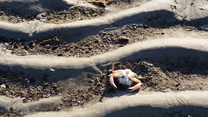 „Dazu kommt noch, dass die ausgebaggerten Flussbettsedimente der Unterelbe, die hier in der Salzwasserumgebung verklappt werden, ja Süßwasserbakterien enthalten, die hier absterben und das „Watt-Mikrobiom“ noch weiter verändern. Und wir reden hier nicht von ein paar Lastwagen voll belastetem Schlick, sondern von Hunderttausenden Kubikmetern, die hierhin verklappt werden. Auch die toten Bakterien werden zu Schlick und befördern eine riesige Algenblüte im Watt, die nachher auch wieder absterbendes Pflanzenmaterial hinterlässt, das kaum abgebaut wird. Mehrere Quadratkilometer hat sich diese Algenpest im letzten August hier ausgebreitet, das gehört hier überhaupt nicht hin und zeigt deutlich, dass hier was nicht stimmt!“